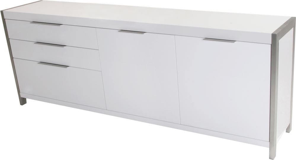 Sophisticated sideboard in matt white with brushed stainless steel base.