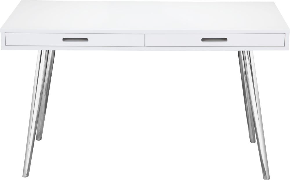 Modern two drawers office desk. Made of white lacquer, MDF and polished stainless steel base. The dimensions are 52"w x 34"d x 30"h.