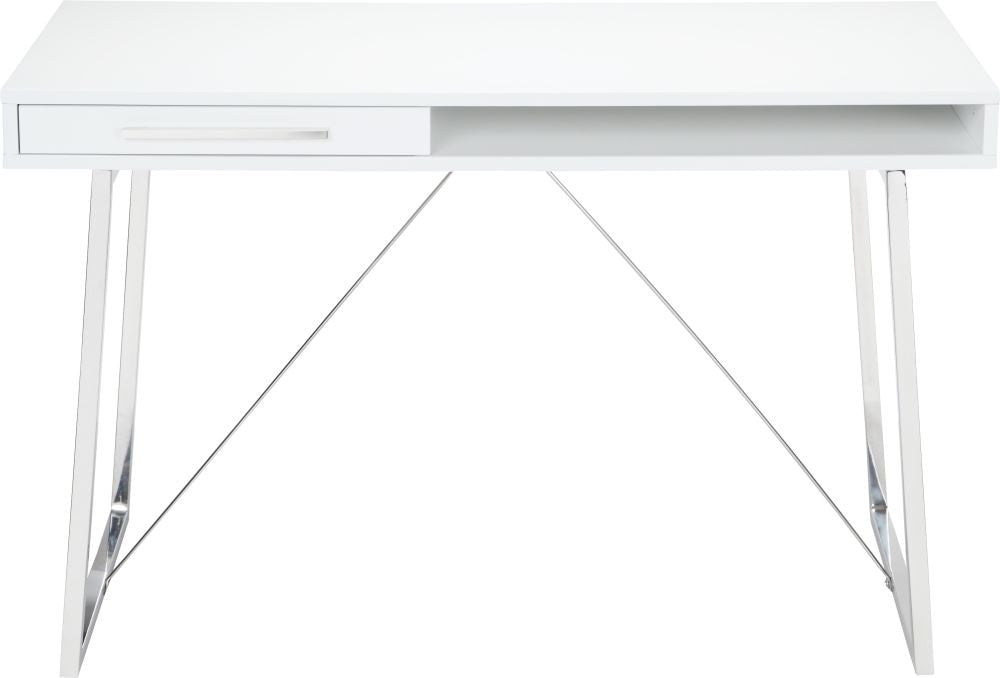 Modern 1 drawer office desk. Made of white lacquer, MDF and polished stainless steel base. The dimensions are 48"w x 24"d x 30"h.