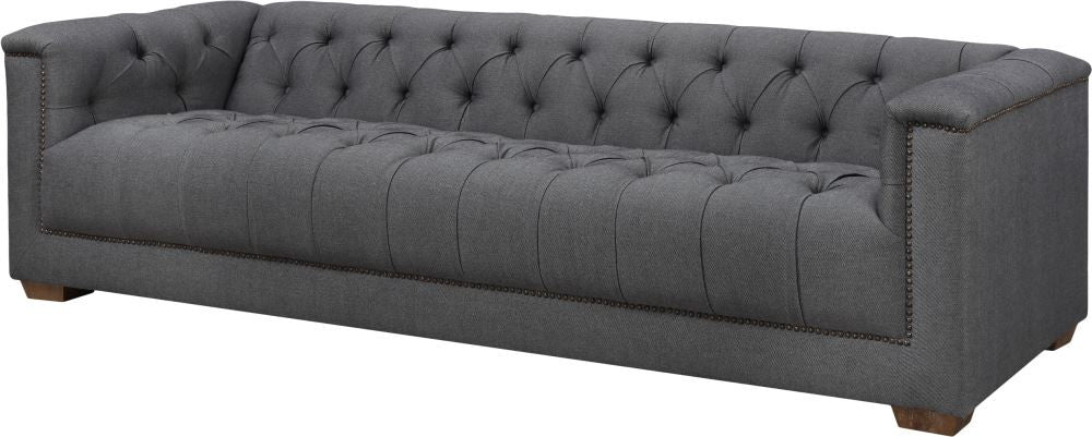 The Winston sofa is classically elegant with gorgeous tufted back and seat accenting, as well as a nail head trim. It is made with solid pine wood, plywood, and the fabric is 80% polyester and 20% linen.