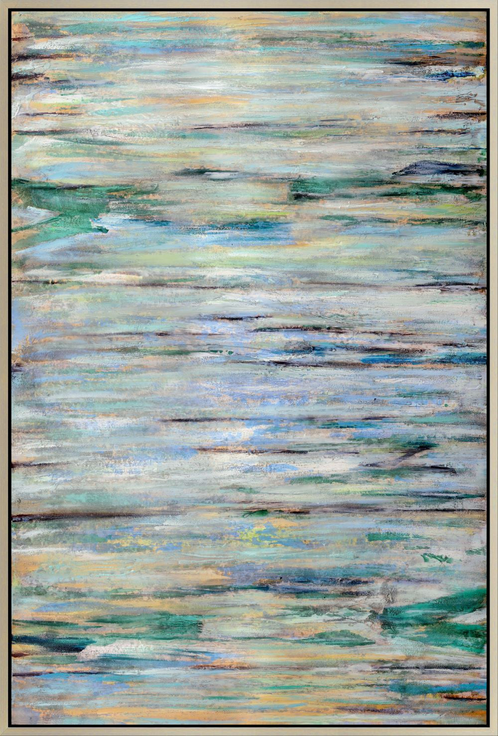 Looks like the top of a serene pool. Earthy greens and faded blues. Acrylic paint. Comes with frame.