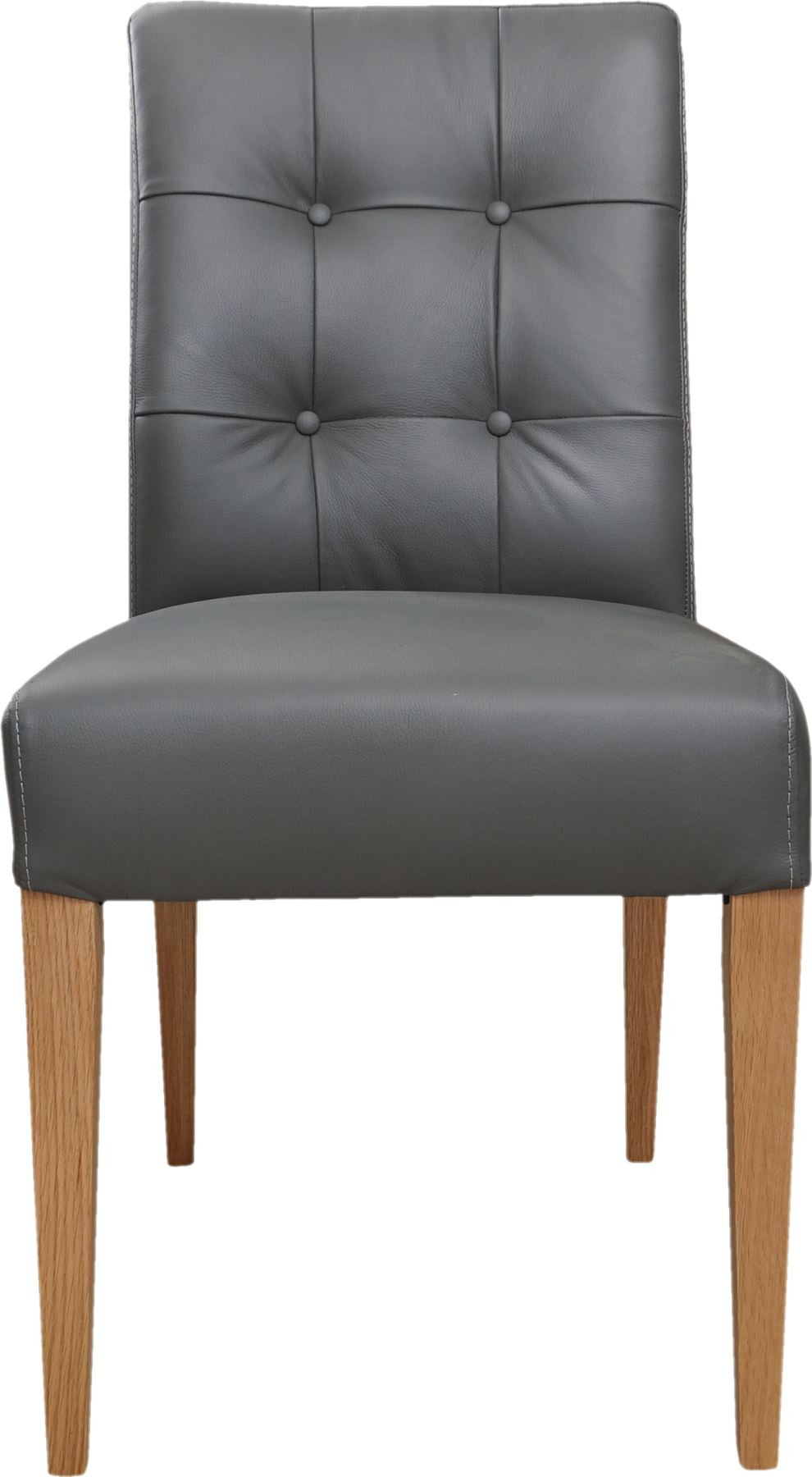 Classic, vintage style leather dining chair. Armless with tufted back. Available in white and grey. Leather with solid oak legs.