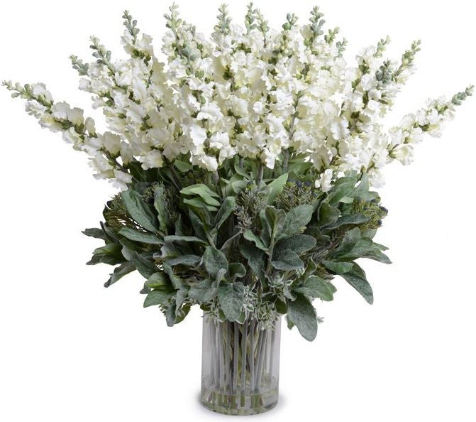 Faux Fresh long stems of Snapdragon are arranged with a collar of Protea with blue buds, textured silvery gray-green Lamb's Ear, and white-green Euphorbia. All artificial flowers are of the finest artificial construction, and make a spectacular large gray-green & white centerpiece arrangement. The Ed Glenn original design is assembled by hand and set into a 7" diameter x 10" height glass cylinder vase. Overall dimensions: 26" diameter x 36" height.