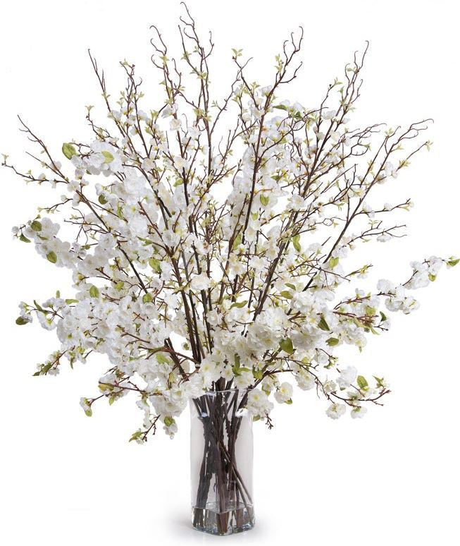 This rustic arrangement of lifelike white Cherry Blossoms is a spectacular display for any season. The dark, natural-looking branches are filled with dozens of realistic flowers with small green leaves. Each stem is permanently set in the clear acrylic solution that looks just like water. The 4.5 foot bouquet is arranged by hand in a mouth-blown glass column vase that measures 6.5" dia. x 15" high. Overall dimensions: 44" dia. x 54" high. Ships FedEX Oversize or Motor Freight. Oversize shipping surcharges apply.