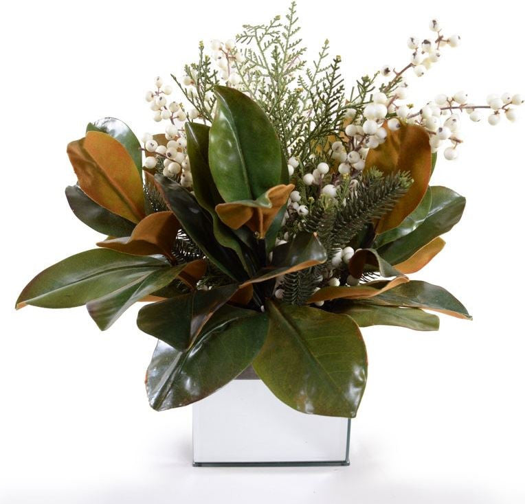 Our realistic reproductions of traditional holiday foliage are a perfect addition to your winter wonderland decor. The modern mirrored cube vase is filled with realistic winter plants including lifelike white Tallow Berries, faux Cedar greenery, and natural-looking Magnolia leaves with glossy green tops and a suede finish underneath. Each piece is arranged by hand and permanently set in a 6 inch modern cube vase. Overall dimensions: 16" long x 16" wide x 16" high.