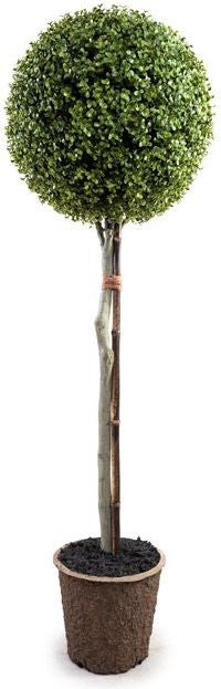 This UV stable topiary is made from a single ball of incredibly lifelike boxwood foliage and can be used to decorate indoors or outdoors. The deep green leaves are rated for up to 5 years of full sun exposure so they won't fade or discolor. The 15" diameter ball is attached to a realistic trunk and staked to natural bamboo. Each element is arranged by hand in the United States and permanently set in our signature faux DurtTM mixture. The included nursery pot is easy to ship and can be hidden inside a variety of containers. Overall dimensions: 15" diameter x 54" high.