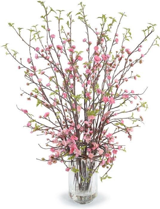 This intriguing, Asian-inspired arrangement is made up of one dozen realistic Cherry Blossom Branches. The delicate pink flowers are in full bloom. The stems look fresh-cut and have been arranged by hand in a permanent clear acrylic solution that looks just like water. The large cylinder glass vase measures 7" diameter x 10" high. Overall dimensions: 24" diameter x 42" height.