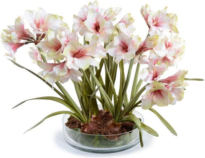 Artificial Amaryllis Leaf It arrangement with large mauve-white flowers is hand-assembled in our 19" diameter low glass bowl, 32" Diameter x 30" Height.Handmade using Leaf It, our patent pending construction method,which allows easy removal fromthe container, for cleaning of the dish, or display in your own bowl. Oversize item, must ship motor freight truck.