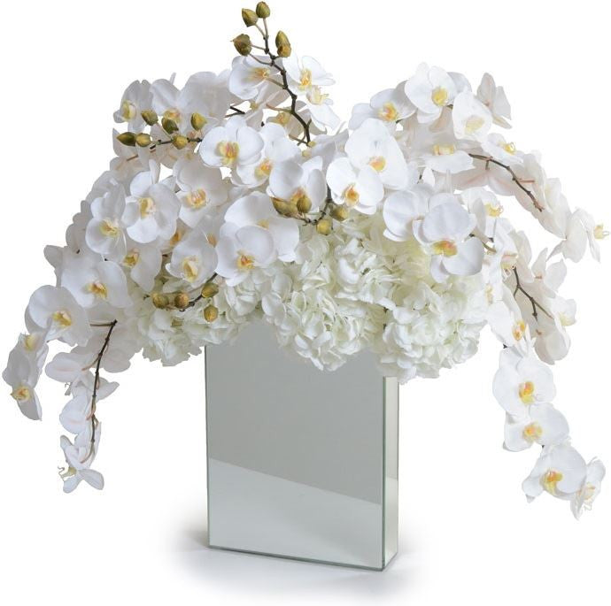 This unique arrangement of realistic white flowers with multiple blooms is at once messy and clean as it comes spilling out of of a sleek mirrored glass vase. Several full white faux Hydrangea flowers are arranged at the base of the bouquet while our extremely lifelike trailing white Phalaenopsis Orchid stems full of buds and yellow-centered blooms cascade from the top. The arrangement is reminiscent of a wedding gown and is ideal for decoration in formal settings. Overall dimensions: 34" long x 24" wide x 34" high.