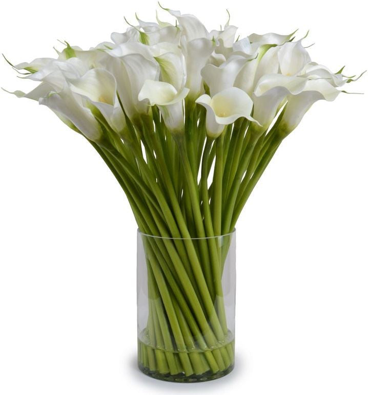 Tall white Calla Lily artificial flowers are grouped in a dramatic bouquet of fifty-four stems, arranged in a 7" diameter x 10" high clear glass cylinder vase in acrylic "water". Arrangement measures approximately 22" diameter x 30" high.