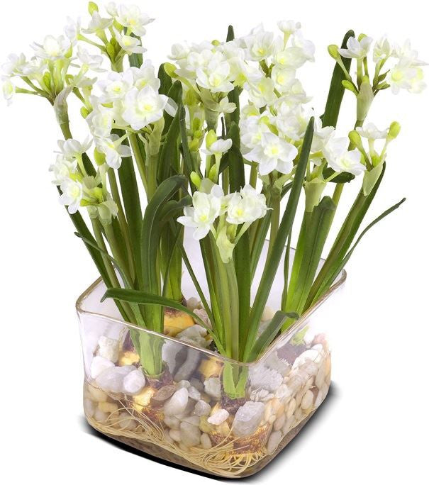 Seven beautiful blooming Paperwhite Narcissus artificial bulb plants with roots rest in small natural stone with acrylic solution in a 7 inch handmade glass cube vase, 15 inch height. Delicate white flowers atop slender stems, the Paperwhite is a traditional winter blooming favorite!