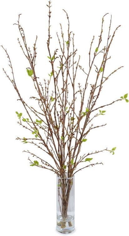 Botanically simple natural-looking brown branches with just a few green budding leaves are very realistically arranged in our 13 tall glass cylinder vase with clear acrylic, 48" height.