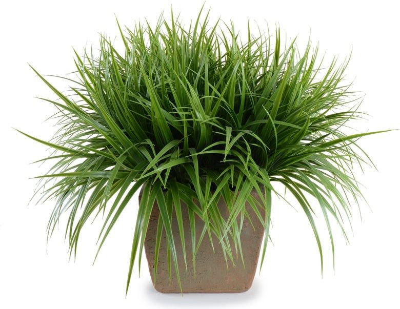 Simple and lively, this ordered mess of lifelike ornamental grass stays a luscious green color year-round. The arrangement is assembled in America in a weathered 9" terracotta cube pot. Measures approximately 22" x 22".