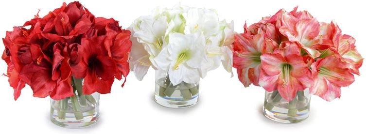 Like freshly cut stems, this simple bouquet of artificial Amaryllis rest in acrylic "water" in our heavy glass cylinder vase. Overall dimensions 12" wide and 12" high.