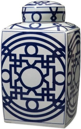 Blue & White Square Tea Jar With Pattern of Lines - Large