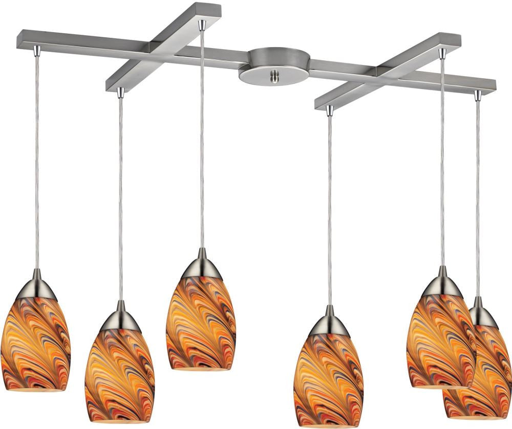 Mini Vortex 6 Light Pendant In Satin Nickel and Rainbow Glass