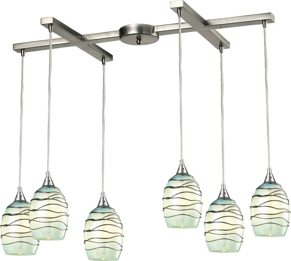 Vines 6 Light Pendant In Satin Nickel and Mint Glass
