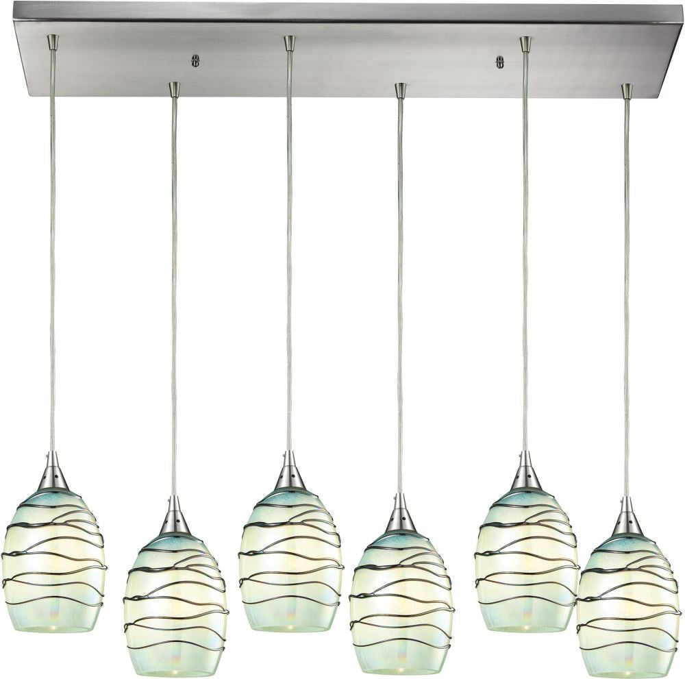 Vines 6 Light Pendant In Satin Nickel and Mint Glass